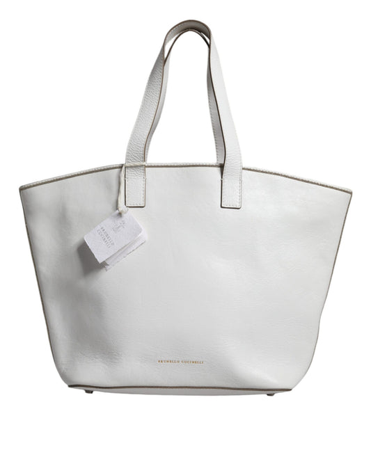 Brunello Cucinelli White Leather Logo Shoulder Strap Shopping Tote Bag