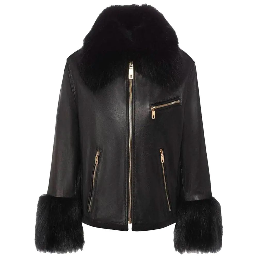 Dolce & Gabbana lambskin jacket, black raccoon fur detail, leopard print lining. Made in Italy